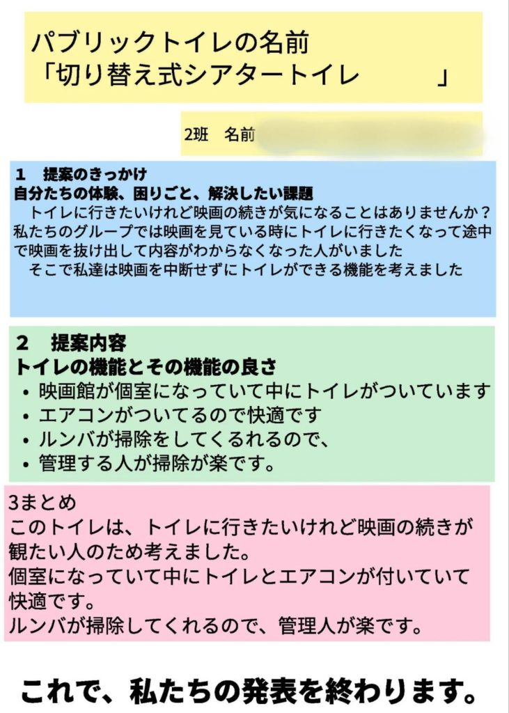 7月2日(水) 天童市立荒谷小学校にて、TOTO株式会社とインターネットで繋がる遠隔授業「あなたの地域に合わせたパブリックトイレを考えよう!」を実施しました。  子どもたちの発表アイデアを中心に、授業の様子をレポートにまとめましたので、どうぞご覧ください。