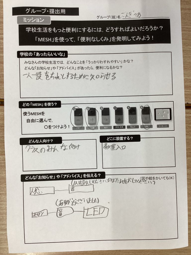 クラスのみんなに向けて、1人1役の係の仕事ができていないことを防ぐために、係の仕事をお知らせするプログラミングを作り、教室の入り口にMESHの人感ブロックを置きました。人が通ると「1人1役の仕事をしてください。終わったらこのボタンを押してください」と音声が流れます。仕事が終わってボタンを押すと「ありがとうございます」という音声と一緒にLEDのブロックが光るようになっています。これで、教室に来た時にみんながそれぞれの係の仕事を忘れずにできるようになります。